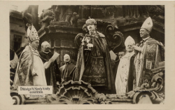 Le 30, à 9 heures, le Roi Charles IV de Hongrie (et III de Bohème) entrent à l’Eglise Matthias., accompagné du carrosse tiré par 8 chevaux blancs où avait pris également place le Prince héritier de 4 ans, Otto de Habsbourg-Lorraine. L’étiquette n’imposait pas sa présence mais Charles Ier a tenu à marquer la continuité dynastique par ce geste. Le Palatin Tisza (bien que le siège de Palatin soit réservé aux catholiques, le Premier Ministre Hongrois étant calviniste avait réussi à l’obtenir) et le Primat de Hongrie le couronnent Roi. La prestation du Roi dite à l’extérieur de l’église, Charles monte sur un cheval blanc et s’élance sur un monticule de terre apportée de toutes les régions de Hongrie, place Saint George et bénit les 4 points cardinaux de son épée.